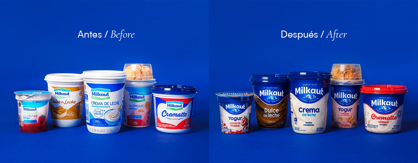 Background How could a dairy company, founded in 1926 by a group of twenty-nine dairy producers from the province of Santa Fe, differentiate itself from the giants of the competition? How to develop a value proposition that generates impact, adds mystique to the brand, without losing focus on the quality of its products? How to create an identity, a genuine brand personality, capable of delivering results while being both authentic and unique? Idea We had to focus on the human aspect. MILKAUT needed to make a leap in quality, and the focus was on the people who supported the brand: most of the residents of Franck, in Santa Fe, are or were employees of MILKAUT. They are the ones who support and build the brand daily, based on their values of quality, flavor, and dedication. We translated, in design terms, what we received from so many people, to achieve, together, a genuine, authentic brand, and consequently, unique and unrepeatable. Development We developed a new visual identity that stood out on the packaging for showcasing the front of the old creamery, the first in Argentina and one of the most important historical landmarks of Franck. We added four fundamental elements: a cow, a fragment of plowed land, a mill, and the silhouette of an ombú tree. All these elements are part of the natural landscape of Franck. Result The work transcended the boundaries of the business: the employees of Franck were moved during the presentation of the new visual identity, which awakened pride among all the villagers. In the strategic segments of cream, dulce de leche, yogurts, spreads, and crematto, the brand experienced a 21% growth during the first three months in the market, compared to the same quarter of the previous year. The growth of dulce de leche during this same period was 40%. We applied the brand over a deep blue that had been part of its initial packaging and conveyed the new momentum of the brand, in addition to its sincere and family-oriented personality.