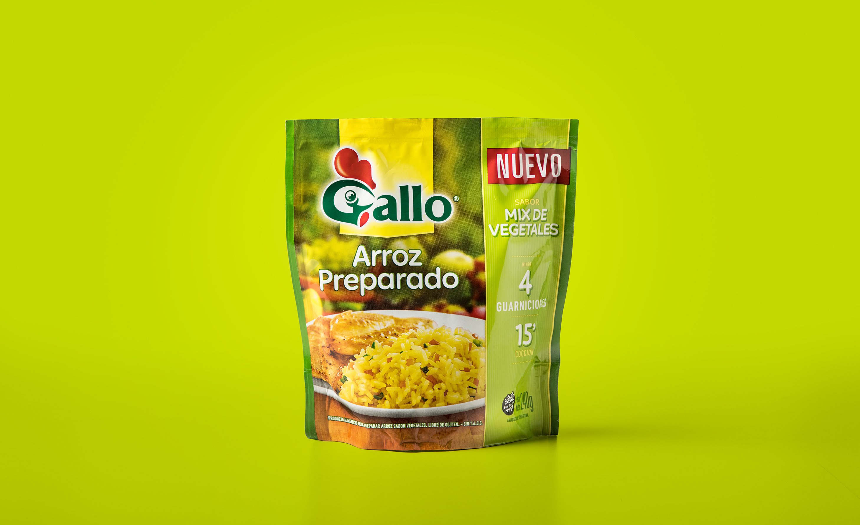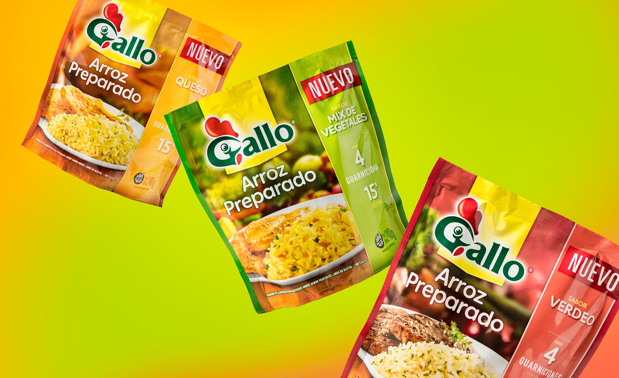 A meses del rediseño que desarrollamos para toda la línea de Gallo, Molinos Río de la Plata nos convocó nuevamente para el lanzamiento de sus primeros arroces preparados. En su rol de líder de la categoría era clave que Gallo sea quien innove con este tipo de propuesta. El nuevo diseño se muestra colorido y con mucho sabor, con una personalidad más joven pero respetando los ejes básicos de la arquitectura de la marca.