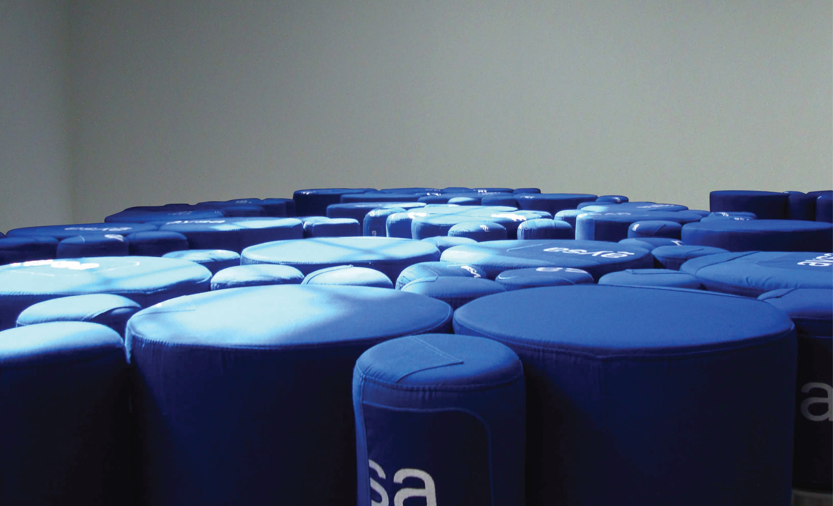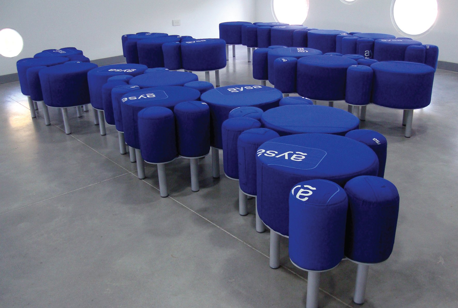 Mobiliario diseñado a partir de material de descarte realizado por encargo del Departamento de Proyectos de la DAL - Dirección de Apoyo Logístico, para equipar las nuevas instalaciones de las Casitas del Agua. La búsqueda estuvo orientada en trabajar con los descartes industriales que generaba la empresa con el fin de visibilizar la posible transformación de un desecho en un producto funcional a partir del diseño como factor clave en la generación de valor. En la primera etapa se relevaron los distintos tipos de descartes que se encontraban en las plantas, cuáles eran los materiales, qué uso se le daba, qué cantidades se generaban mensualmente, si había programas de reciclado para esas piezas, etc. Finalmente se seleccionaron una serie de tubos de pvc para conducción de agua que se encontraban vencidos y uniformes en desuso. Con este material se diseñó un equipamiento para las "Casitas del Agua" cuyo objetivo principal era recibir a los distintos colegios que iban de excursión a conocer el proceso de potabilización del agua en las plantas de Aysa. En función de las necesidades del espacio se trabajó en una serie de módulos de asientos nube que podían usarse por separado para que se sienten 4 niños o bien juntarlos todos en una gran nube para que se siente todo el aula. Proyecto desarrollado en conjunto con la diseñadora Luciana González Franco.