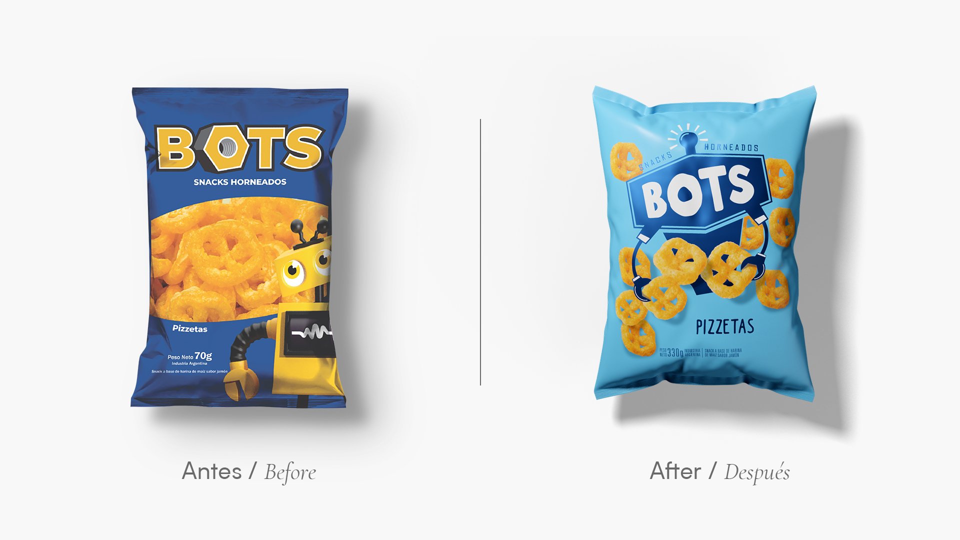 En 2019, previo a la pandemia, Sebastián Ugalde y Juan Alvarez, nos contactaron para cotizar el diseño de una línea de snacks. Compartimos una reunión en nuestro estudio y tuvimos una charla muy interesante. Preparamos una propuesta y a pesar de tener ganas de trabajar con Grupo Berro, nos notificaron que nuestros honorarios eran elevados para el presupuesto que tenían asignado y por lo tanto avanzaron con otro proveedor. La realidad económica de la Argentina hace que sean muchas más las veces que nos dicen que no a las veces que nos aprueban nuestros honorarios. Pero nosotros lo aceptamos, son las reglas del juego y cuando nos eligen, nos enfocamos y esforzamos para que el resultado de nuestro trabajo sea siempre una buena inversión y no un mero gasto de marketing. Paso el tiempo y en julio de 2021 nos volvieron a contactar. En esta oportunidad decidieron invertir en diseño. La experiencia anterior había fracasado, las ventas de los snacks a granel crecían y en cambio las ventas de los packs individuales que habían diseñado estaban lejos de los proyectado. En la reunión preguntamos cómo era la calidad de los productos y cómo era la distribución, dos aspectos claves para el éxito de un proyecto. Pedimos muestras de los envases y de los snacks. La calidad de la materia prima es excelente, el producto terminado también y la distribución va creciendo a nivel nacional sostenidamente. Entonces, claramente, era el momento de plantear un buen diseño. Analizamos toda la categoría de snacks y en detalle a la competencia directa de la marca. Desarrollamos, junto a Andy Anderson un manifiesto de la marca, con un storytelling que remarcaba el origen y la calidad de elaboración. Y en la etapa de diseño creamos un personaje que represente a “Bots” y diseñamos los packs de los 3 productos de la línea con un estilo simple y colorido que combina lo lúdico de los robots, lo llamativo de la categoría de los snacks con fotografías de los productos reales que en el conjunto muestran a una marca con buena visibilidad y gran destaque en el punto de venta. A pocas semanas del relanzamiento la marca se ha expandido ya a varias provincias y todos los distribuidores realizaron nuevas compras. El nuevo diseño de Bots se presenta muy prometedor y es una clara muestra de la importancia invertir en buen branding para el lanzamientos de una marca en consumo masivo.