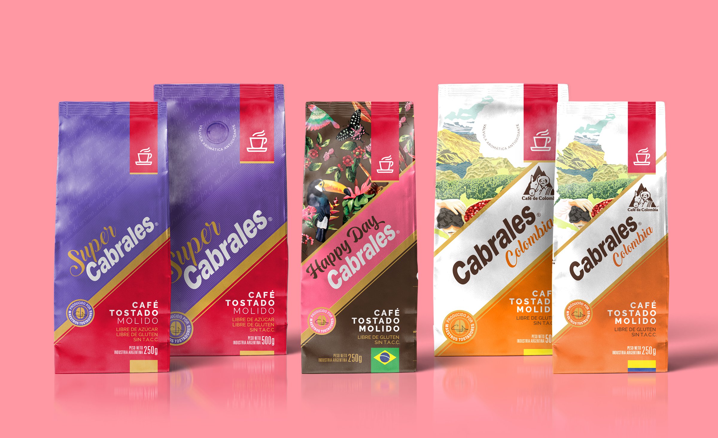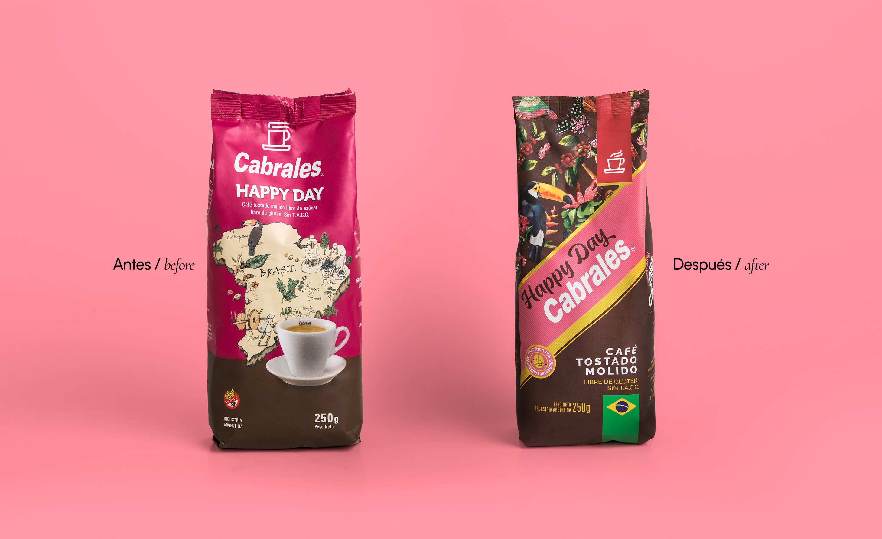 Para esta reconocida marca, líder de café en la Argentina, desarrollamos su línea completa de cafés. Las primeras marcas siempre necesitan trabajar sus diseños de forma tal que muestren una evolución lógica, mantengan su vigencia y liderazgo, y se destaquen en el punto de venta. Dentro del diseño desarrollado para toda la línea de Cabrales fue clave que cada tipo de café mantenga su personalidad. En el caso de Cabrales Happy Day, que es un café tostado de Brasil, en su diseño anterior tenía un característico color rosa. Tomando ese reconocible color como elemento diferencial y bajo la misma arquitectura de toda la familia, agregamos una ilustración con aves y flora colorida para dar ese toque alegre típico del Brasil. El resultado es un packaging vistoso, colorido y atractivo que invita a probarlo y fortalece la variedad de diseños que ofrece Café Cabrales.