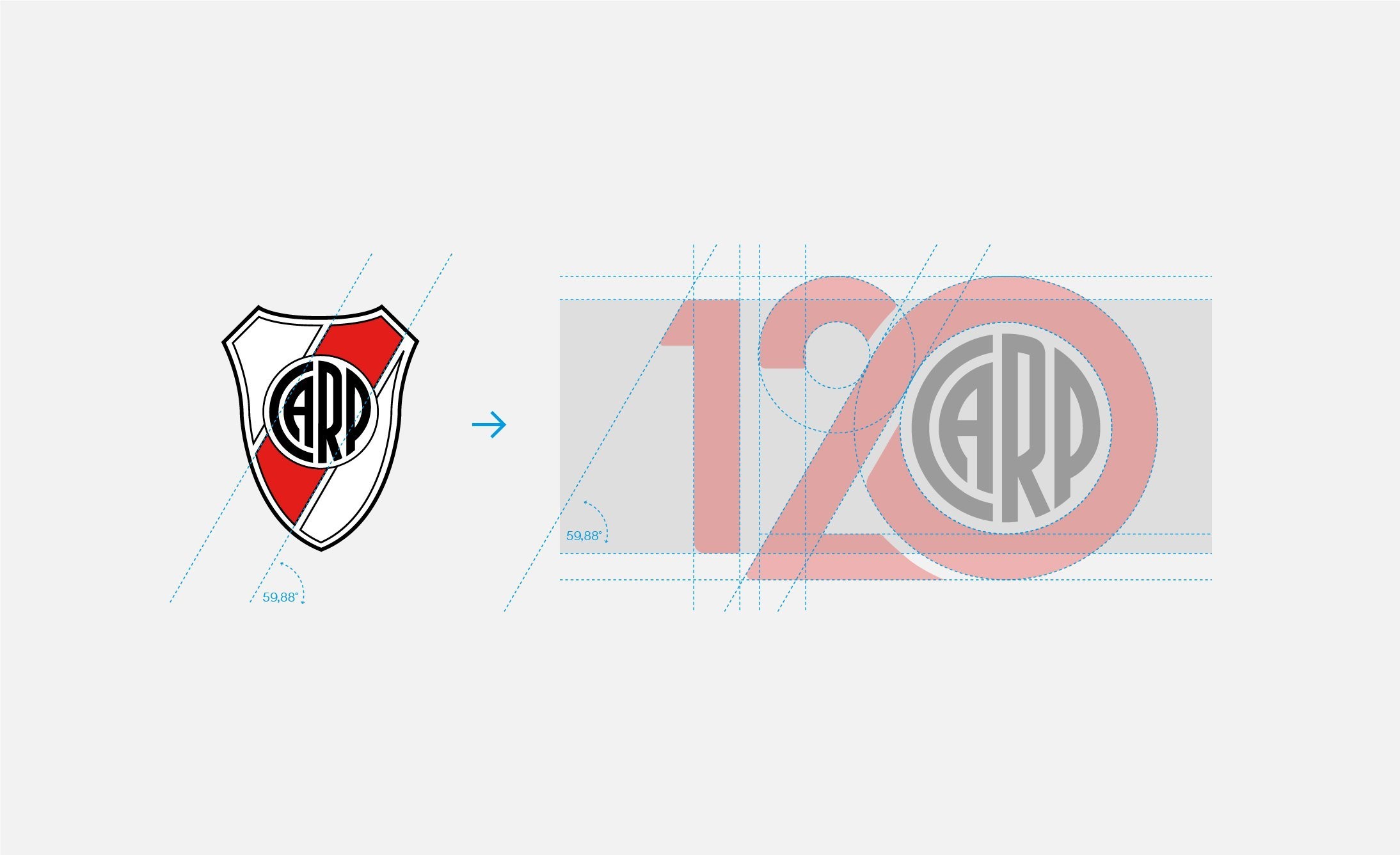 Para la evolución del escudo, respetamos la especial inclinación de 59,88 grados de la banda roja. Realizamos mínimos ajustes en las 4 letras que conforman el emblema “CARP” y también hicimos una sutil limpieza de las finas líneas del escudo anterior, para facilitar y mejorar la lectura y visibilidad del símbolo en todas las plataformas de comunicación.