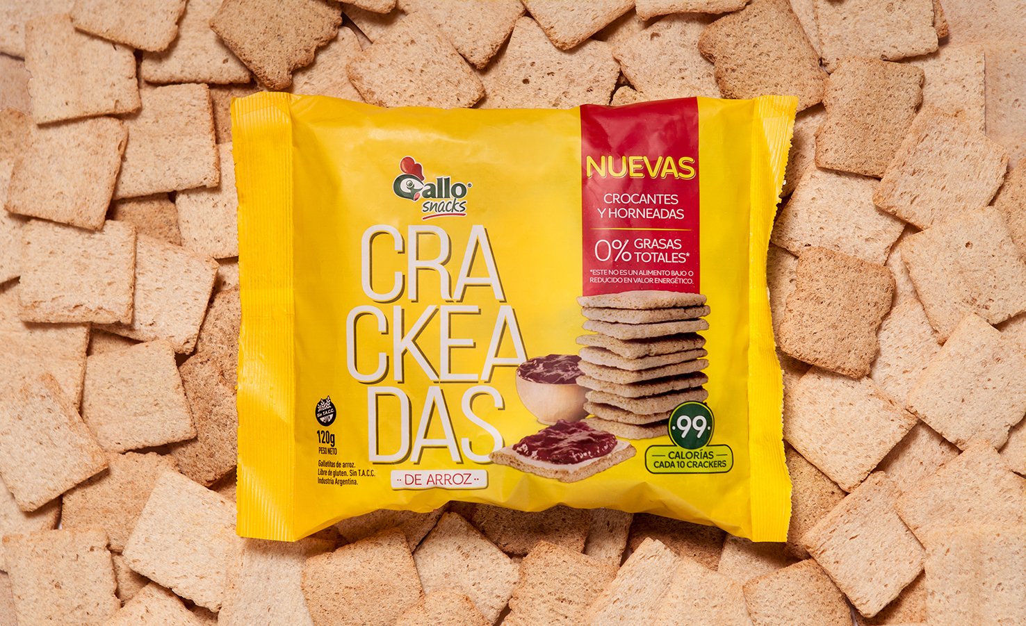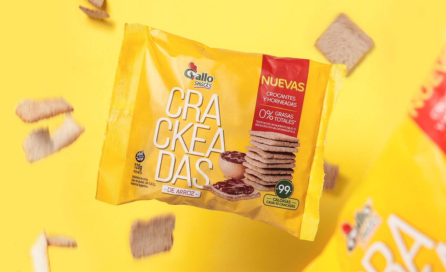Gallo Snacks sigue sorprendiendo con sus nuevos snacks saludables. En esta oportunidad Molinos encargó a Grupo Berro el diseño de sus nuevas galletitas de arroz, Crackeadas. El proyecto Las nuevas Crackeadas son galletitas crocantes para disfrutar snacks ricos con menos de 99 calorías. El diseño, da un paso hacia adelante para fortalecer la individualidad y personalidad del nuevo producto, siempre con el ADN intacto de Gallo Snacks. El resultado Un diseño colorido y disruptivo para tentar a todos los que quieran comer rico y saludable.