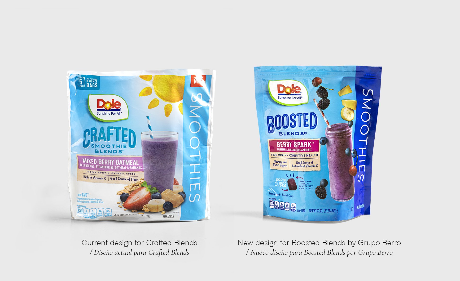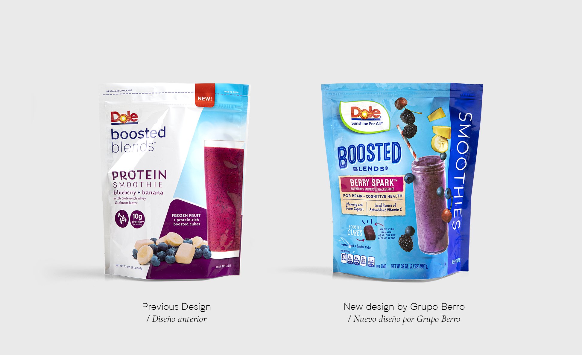 Con presencia en más de 90 países, Dole es una marca icónica de frutas con 120 años de trayectoria. Con el lema ’sunshine for all’ la filosofía de la compañía se basa en que la buena nutrición debería estar al alcance de todos, tal como la luz del sol. Dole había realizado un cambio de diseño para sus productos dejando de lado un estilo de packaging que acompañaba a la marca desde hacía varias décadas. A inicios del 2021 asumió un nuevo management y notaron que algo del ADN de la marca se había perdido con esos nuevos diseños. Fue en ese momento que contactaron a Gonzalo Berro para ver si Grupo Berro contaba con la experiencia para el desafío que tenían frente a ellos. Luego de una serie de reuniones Dole eligió a Grupo Berro para que ayudemos a recuperar el ADN de la marca y que con el nuevo diseño también fortalezcamos el apetite appeal de sus productos. En una primera etapa, aprovechando el lanzamiento de un nuevo producto dentro de la línea, de forma urgente nos encargamos de trabajar este diseño ‘puente’. Este nuevo producto va a compartir espacio con la línea existente y el desafío era lograr unidad en la familia para que haya armonía visual pero que al mismo tiempo el nuevo diseño muestre los primeros rasgos de un criterio de branding. El nuevo ‘Berry Spark Boosted Blend respeta la estructura gráfica de la línea Crafted Smoothies (ver comparativo) pero presenta una nueva imagen más moderna y descontracturada donde el vaso y las frutas están en movimiento con mucha más naturalidad y frescura. Por otro lado, definimos quitar la imagen del sol ilustrada para que el protagonismo lo tenga la marca y la imagen. Cuando vemos el antes y después se nota claramente cómo Dole recupera protagonismo en el punto de venta. Y este proyecto es solo el principio!