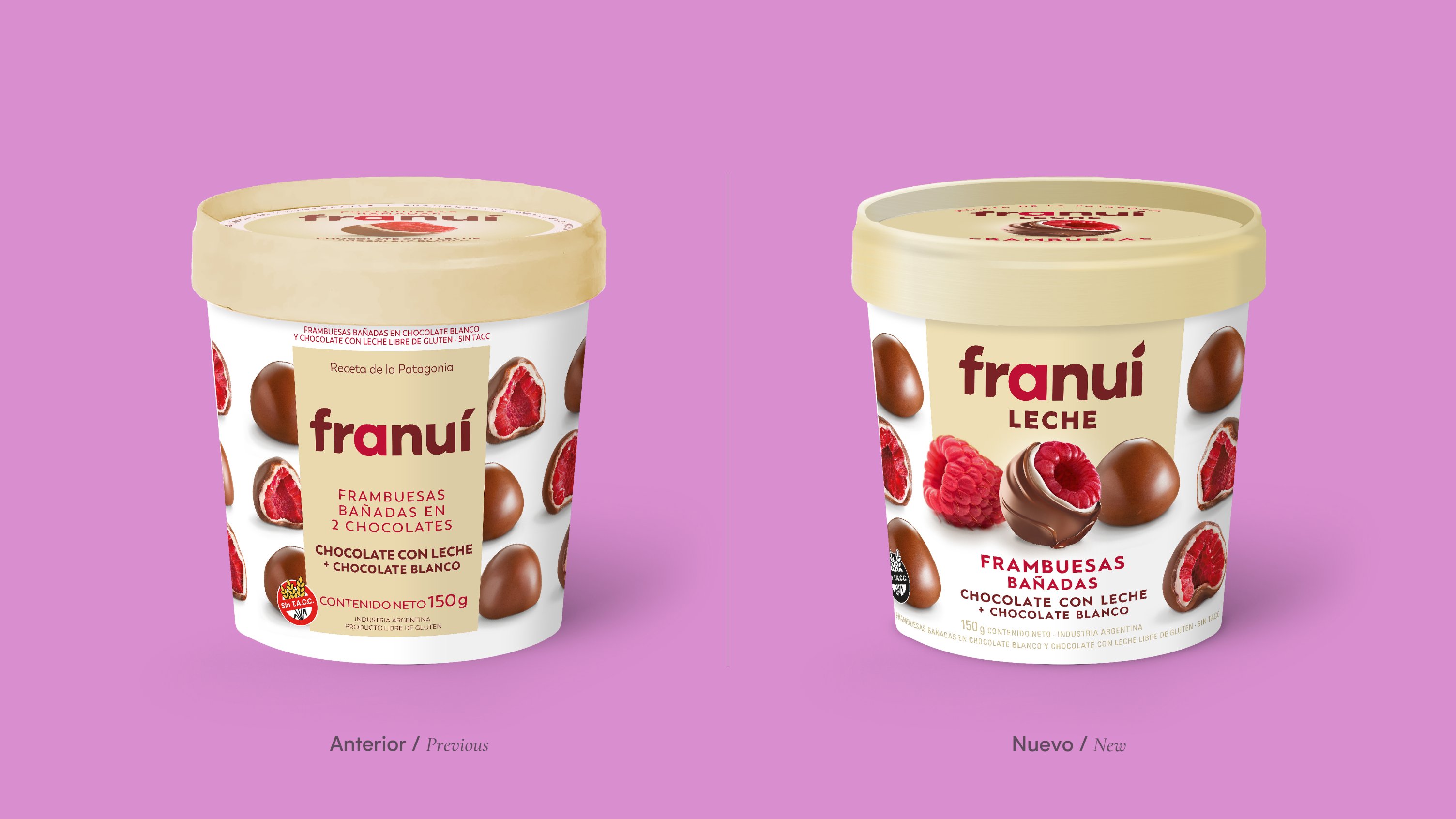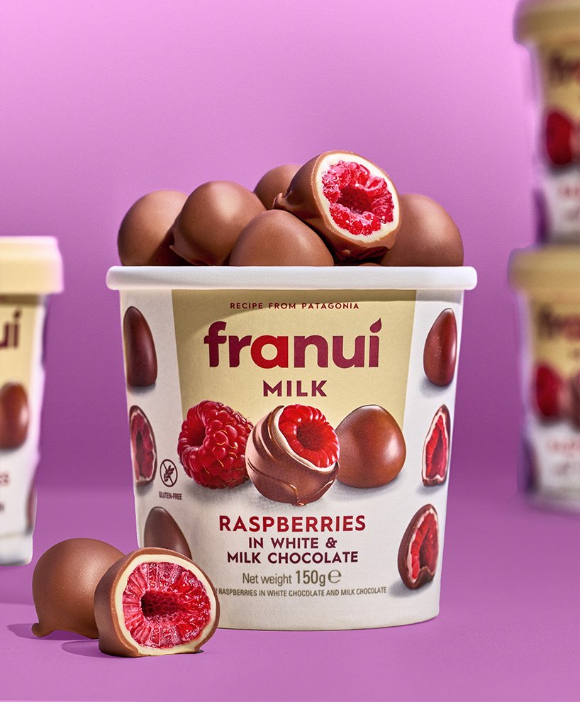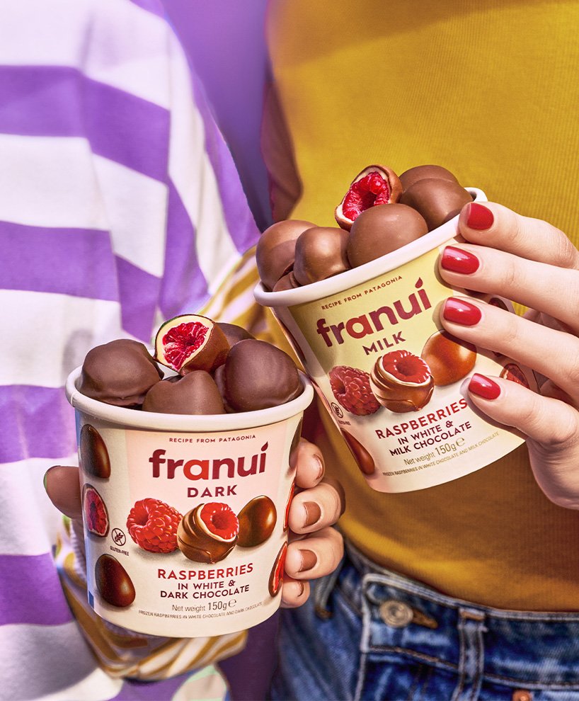 Redefiniendo la excelencia: El rediseño de Franuí ¿Cómo se reinventa una marca que ya es un éxito rotundo? Franuí, la brillante creación de Diego Fenoglio, fundador de Rapanui, es un snack de fruta y chocolate que no solo gusta, sino que asombra. Su inigualable capacidad para provocar el famoso efecto ‘wow’ en cada bocado ha llevado a esta marca innovadora a conquistar más de 30 países. Con un espíritu disruptivo y una pasión constante por la mejora, Franuí ha decidido dar un paso más. Para ello, confiaron en la experiencia de Grupo Berro para un nuevo rediseño. Gonzalo Berro, nuestro líder creativo, se sumergió en el corazón de Bariloche para vivir y respirar el mundo Franuí. Durante dos días intensos, junto a Leticia y Aldo Fenoglio, exploró cada detalle del proceso de elaboración de estos deliciosos snacks, absorbiendo la esencia que hace de Franui una experiencia única. La fase de diseño fue una travesía creativa, recorriendo durante semanas, diversos caminos conceptuales para capturar la evolución gráfica de la marca. Finalmente, en conjunto con el cliente, optamos por un ajuste sutil en el logotipo, perfeccionando los detalles de la tipografía y dando a la ‘i’ un acento más orgánico y personal, reflejando así la calidez y autenticidad de Franuí. El packaging, por su parte, necesitaba ser tan irresistible como el producto en sí. Decidimos que la imagen protagonista en el frente del pack sería un Franuí con chocolate derretido, acompañado de una frambuesa y otro Franuí totalmente cubierto, creando una tentación visual inmediata. Mantuvimos los laterales con imágenes de varios Franuis asegurando así la continuidad del reconocimiento visual. Son pocas las marcas que logran ser reconocidas sin ver la marca y no quisimos perder esa virtud. Hoy, los nuevos packs de Franuí no solo tienen una jerarquía de marca superior, sino que también elevan el deseo de probarlos. Con este rediseño, Franuí reafirma su lugar en el corazón de los consumidores, listo para seguir sorprendiendo y deleitando paladares alrededor del mundo.