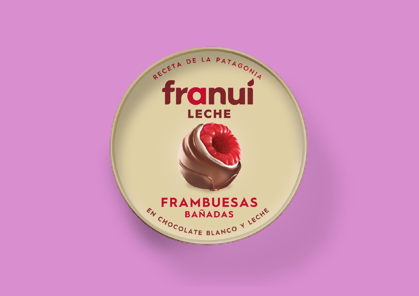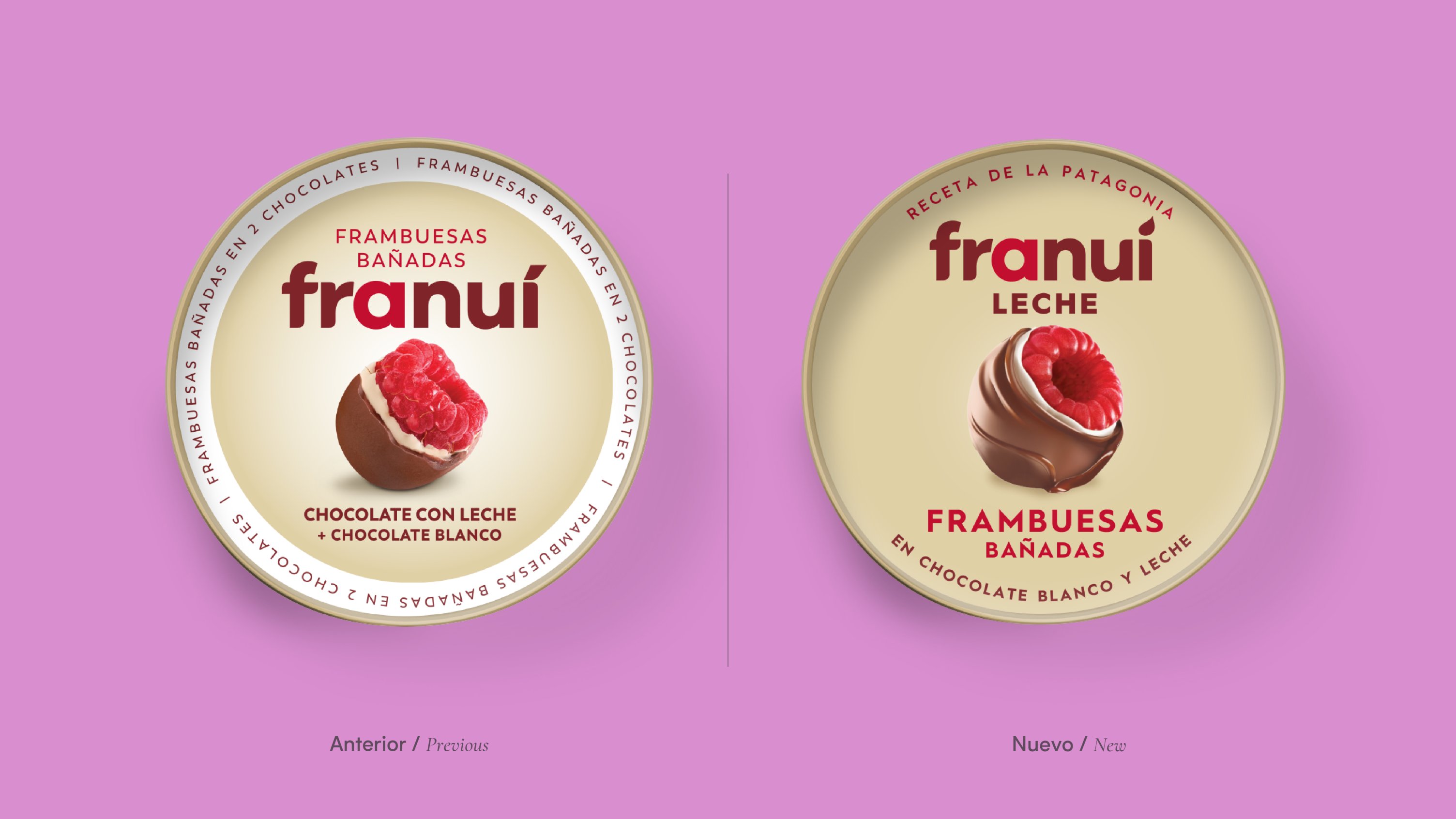 La imagen protagonista en el frente del nuevo pack es un Franuí con chocolate derretido, acompañado de una frambuesa y otro Franuí totalmente cubierto, creando una tentación visual inmediata.