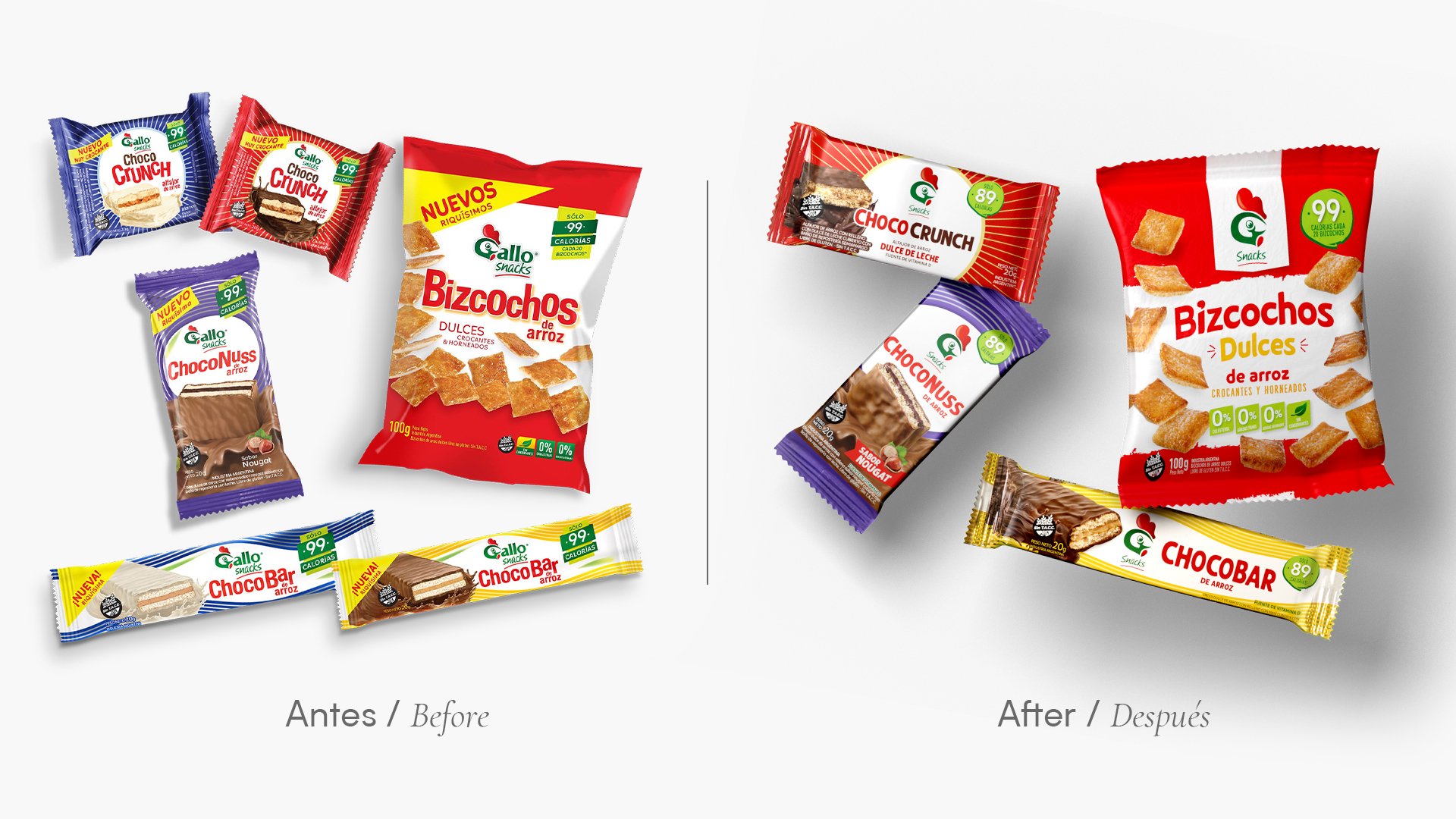 Background En el 2012 eran muy pocos los que pensaban que el arroz podría ser un snack. Molinos, acompañando la tendencia mundial hacia la comida sana, convocó a Grupo Berro para desarrollar la identidad y toda la línea de productos. Hoy, 10 años después, con un liderazgo consolidado en la categoría de snacks saludables, Molinos Río de la Plata nuevamente eligió a Grupo Berro para rediseñar la línea completa. Aprovechando la oportunidad, propusimos un rediseño de la marca. El proyecto “Menos es más” decía el reconocido arquitecto Mies Van der Rohe. En línea con ese concepto Grupo Berro propuso una síntesis de la identidad de Gallo Snacks quitando cuatro letras del nombre principal, destacando sólo el símbolo del gallo aplicado en la “G”. Son muy pocas las marcas que los consumidores las reconocen naturalmente sin la necesidad de leerlas. Con el nuevo diseño Gallo demuestra estar en ese privilegiado grupo. En el caso de los packs, respetando el ADN ya construido a lo largo de una década, definimos una nueva tipografía para los nombres y cambiamos las imágenes, que eran ilustraciones híper realistas, por fotografías reales de los productos que los muestran ricos y verdaderos. El resultado El nuevo branding pone a Gallo Snacks en la vanguardia del diseño y muestra la clara decisión del cliente de ofrecer una constante innovación. La nueva identidad se resume en una letra y destaca la jerarquía de una marca centenaria.