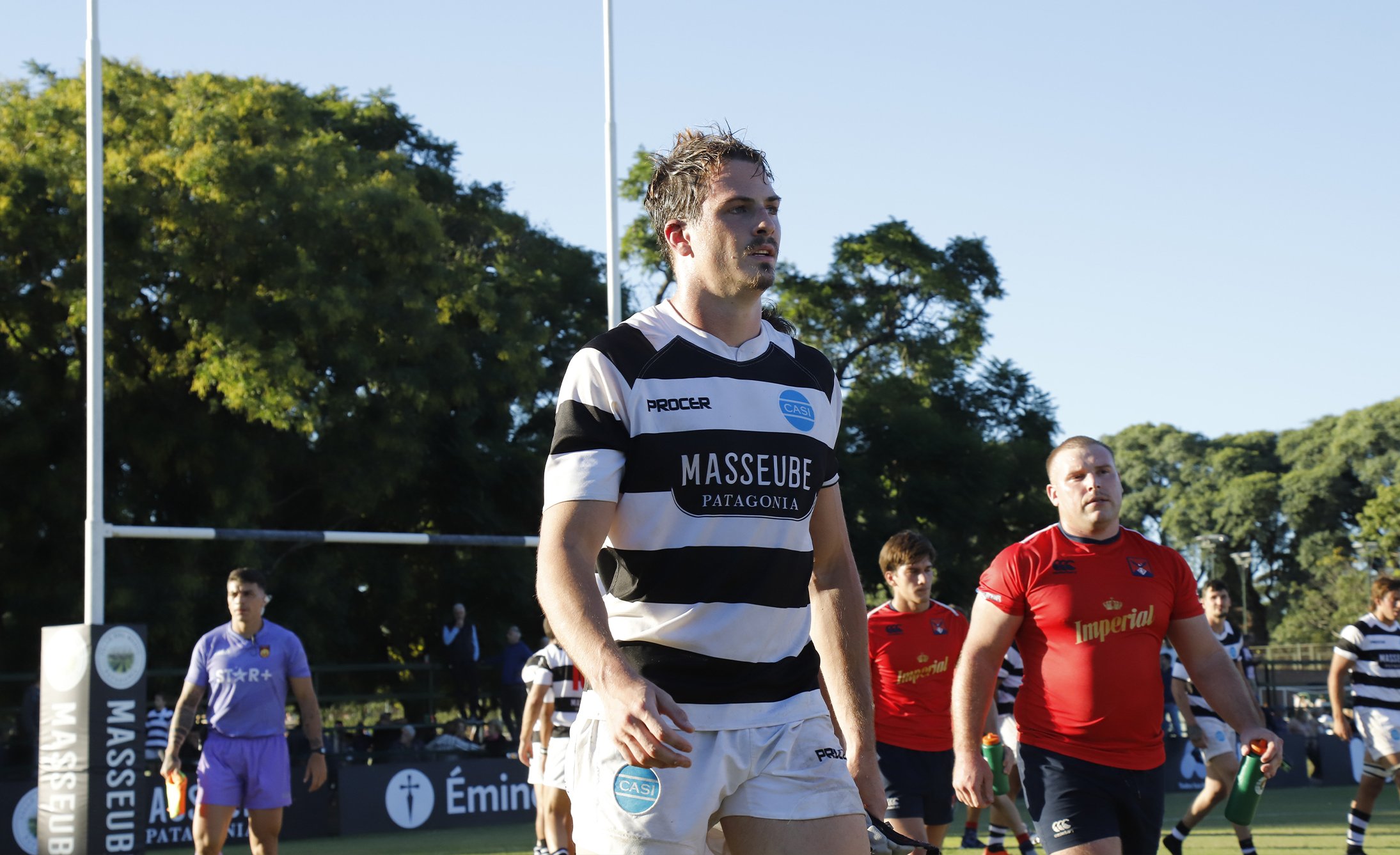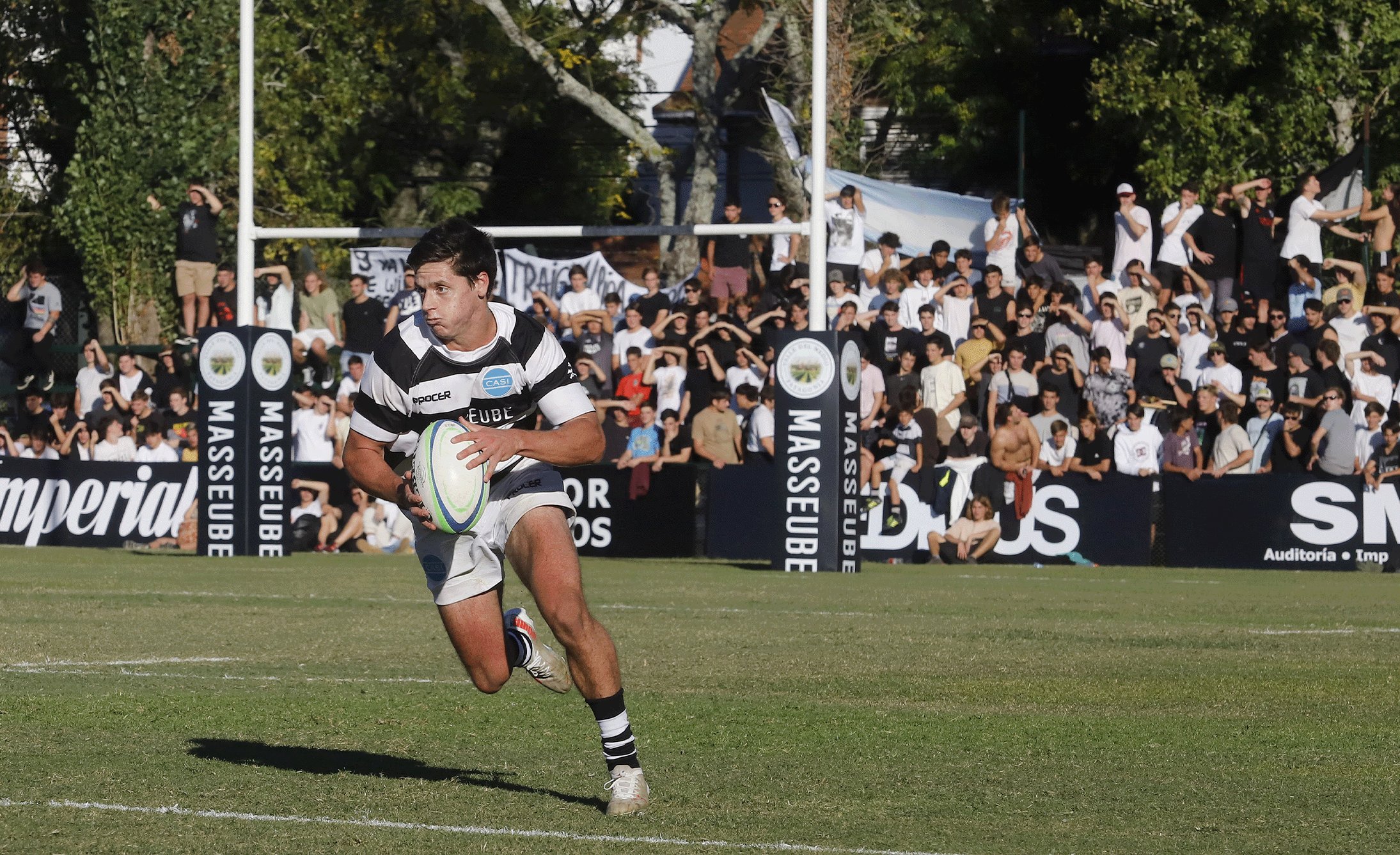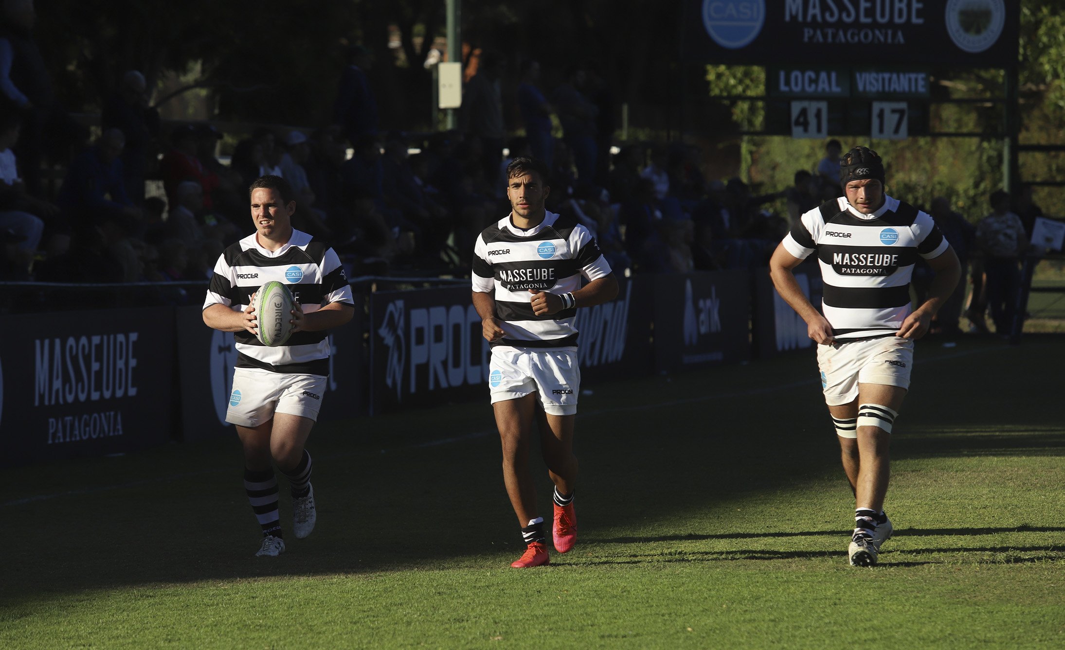 Masseube & Club Atlético San Isidro Main sponsoring Branding Este proyecto es muy especial para Gonzalo Berro. Por un lado está Masseube, una marca de Diego Lerner y Nico Nuñez a quienes Grupo Berro acompaña con el branding y el diseño hace más de 10 años. Y por otro lado está el CASI, que es el club donde Gonzalo se formó y jugó 11 años al rugby, y donde están sus grandes amigos de toda la vida. El trabajo, en líneas generales, era simple. Había que aplicar la identidad de Masseube como main sponsor del CASI en la indumentaria de rugby y de hockey y también en todos los elementos de comunicación de las canchas (cartelería, protectores de los palos y banderines). Pero el desafío era lograr que el diseño de Masseube no se aplique de una forma invasiva, sino que participe logrando una buena presencia visual y que, como nuevo sponsor, el diseño se entienda como parte natural del branding del CASI. En vez de usar el color bordó de Masseube sobre el tradicional blanco y negro de CASI, decidimos aplicar el logotipo sobre fondo negro calado en blanco, brindando elegancia y distinción en las camisetas y también en la cartelería y demás elementos de comunicación. El CASI, aprovechando la celebración de los 120 años del Club, logró que el resto de los sponsors también apliquen sus marcas en blanco sobre negro. Hoy la “catedral de rugby”, como se conoce a la cancha uno del CASI, se presenta con mucha elegancia y proyecta una fuerte consistencia visual.