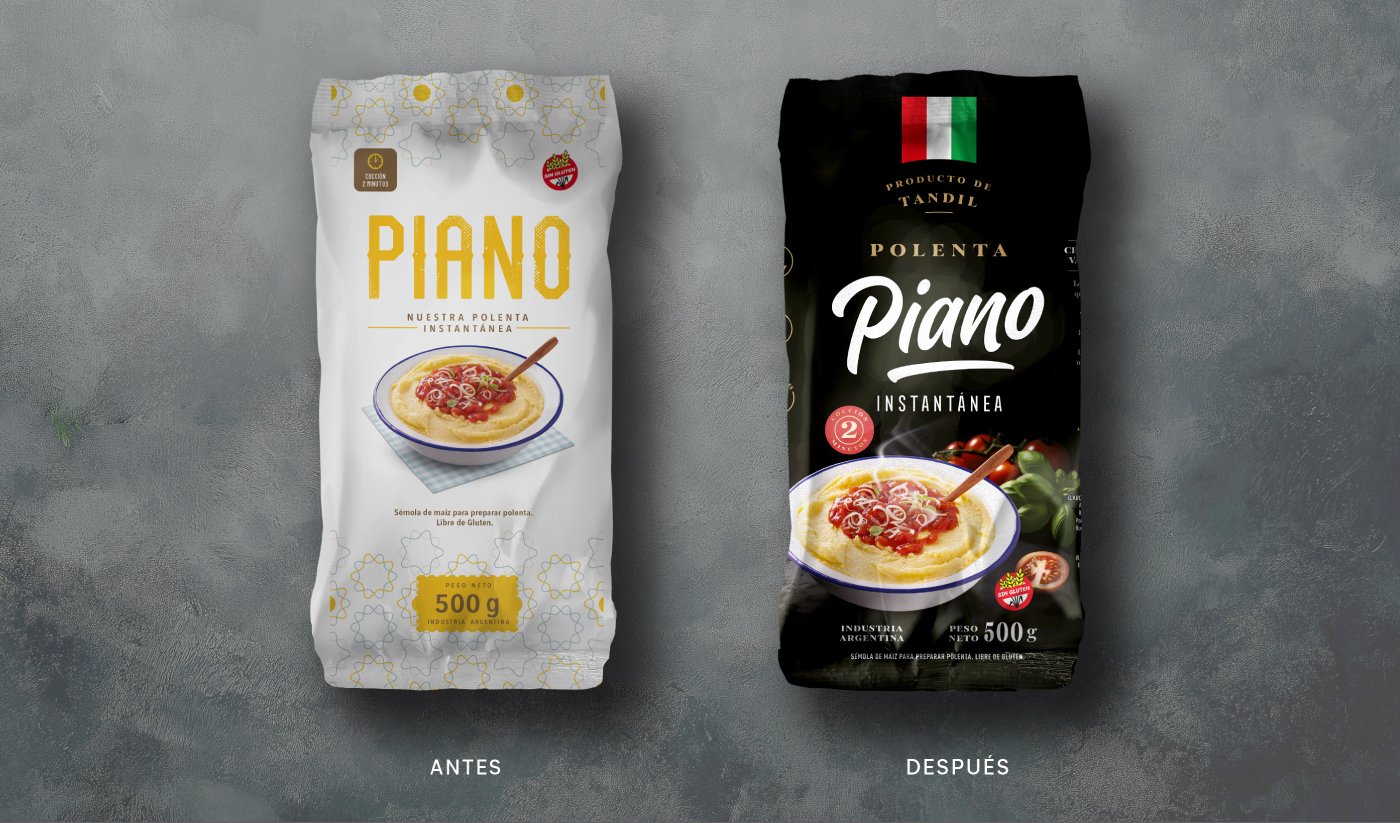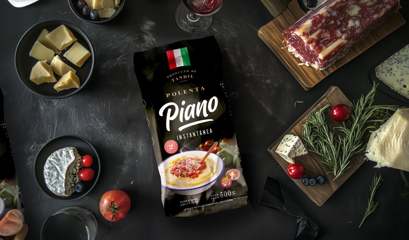 Piano: El diseño de un nuevo clásico Una vez más, Alimentos de Tandil confió en Grupo Berro para darle identidad a uno de sus productos estrella: Polenta Piano, una polenta estilo italiano hecha con maíz de la más alta calidad. Especialistas en la producción de maíz, Alimentos de Tandil ha perfeccionado cada detalle para ofrecer una polenta premium que resalta tanto por su sabor como por su textura inigualable. Nuestro desafío fue crear un packaging que reflejara la excelencia del producto y conectara con los consumidores que buscan lo mejor en su mesa. El nuevo diseño equilibra elegancia y tradición, con color negro de fondo y elementos gráficos que evocan la esencia italiana y destacan la calidad artesanal del producto. Desde la selección tipográfica hasta los detalles visuales, cada decisión refuerza el compromiso de Piano con la calidad y el buen gusto. Hoy, Polenta Piano no solo se disfruta en cada plato, sino que también se presenta con un diseño que hace justicia a la calidad que lleva dentro. Porque cuando se trata de elevar lo cotidiano a lo extraordinario, Piano marca la diferencia.