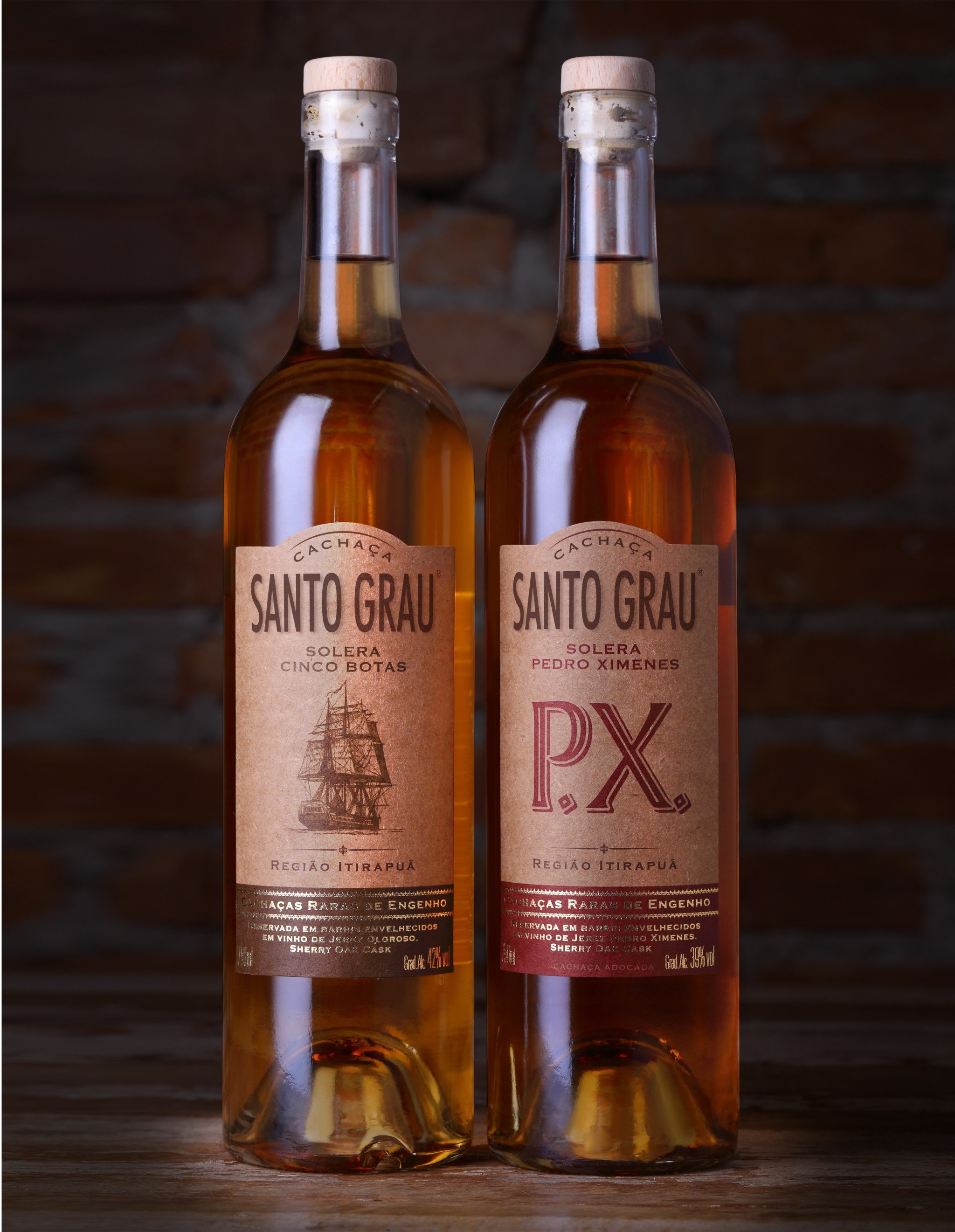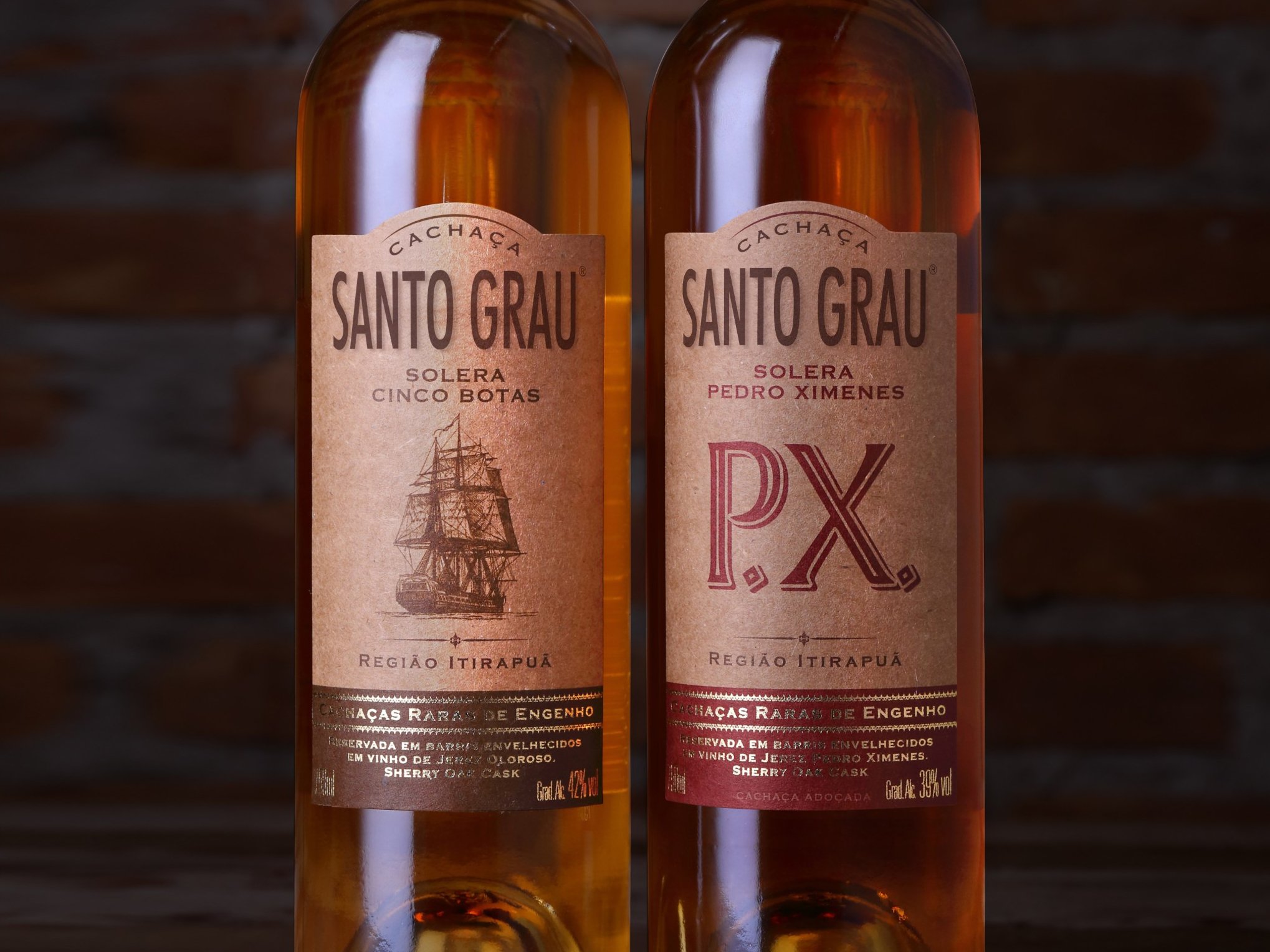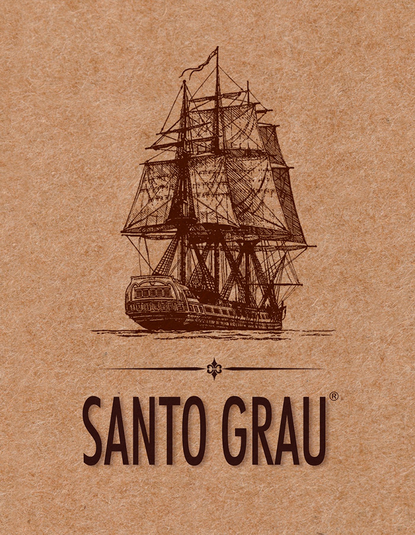 El diseño de packaging de esta bebida alcohólica originada en Brasil responde al producto mismo; generamos etiquetas con elementos que remiten a un fondo de pergamino, a tono con el color ámbar del Santo Grau, en sus versiones Solera Cinco Botas y Solera Pedro Ximenes.