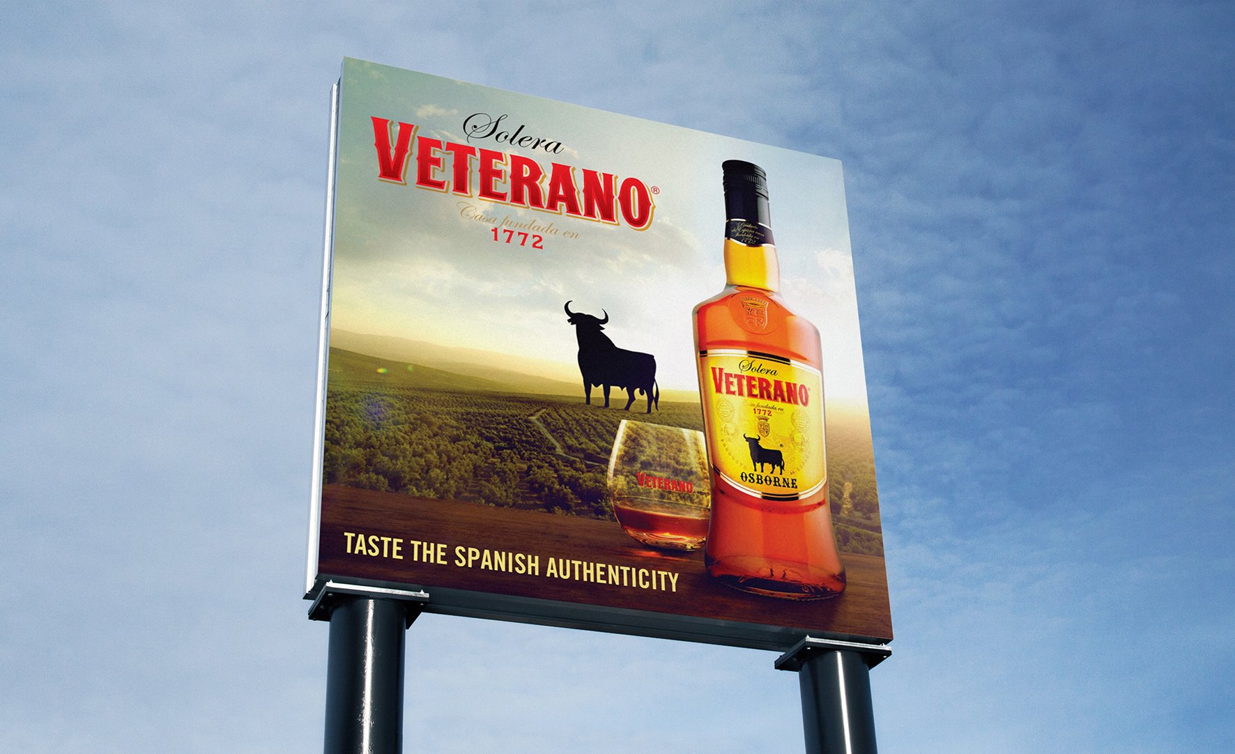 Una vez definido el packaging, propusimos una imagen para el aviso de lanzamiento, detallando un cálido atardecer sobre laderas típicamente españolas, con olivos en hileras, la serranía en un segundo plano, aportándole profundidad de campo y perspectiva a toda la composición. Dos protagonistas se destacaban en el anuncio: el toro de Osborne y la nueva botella de Veterano, seguidos de la frase “disfruta el auténtico sabor español”. La fotografía fue realizada por Diego Berro.
