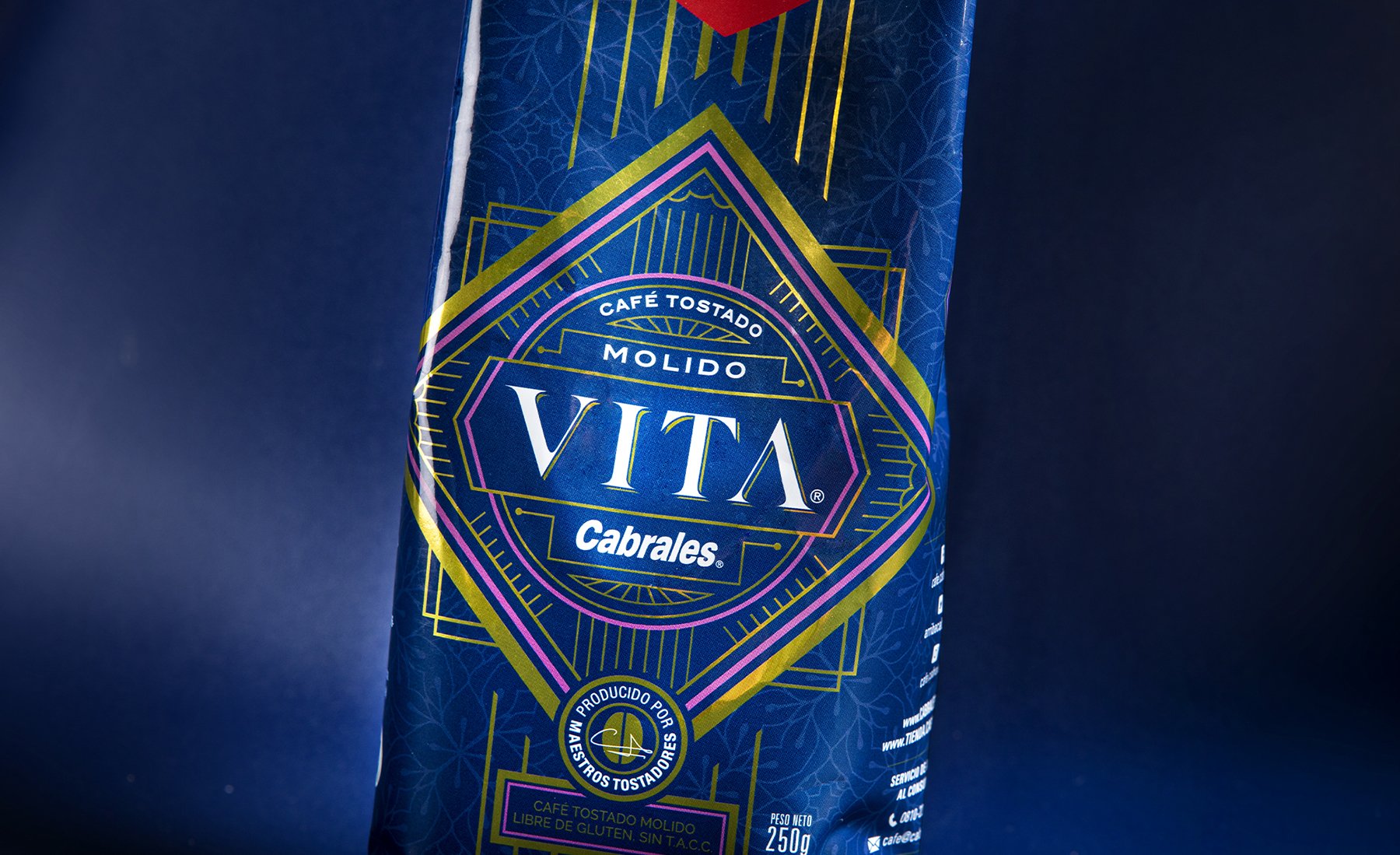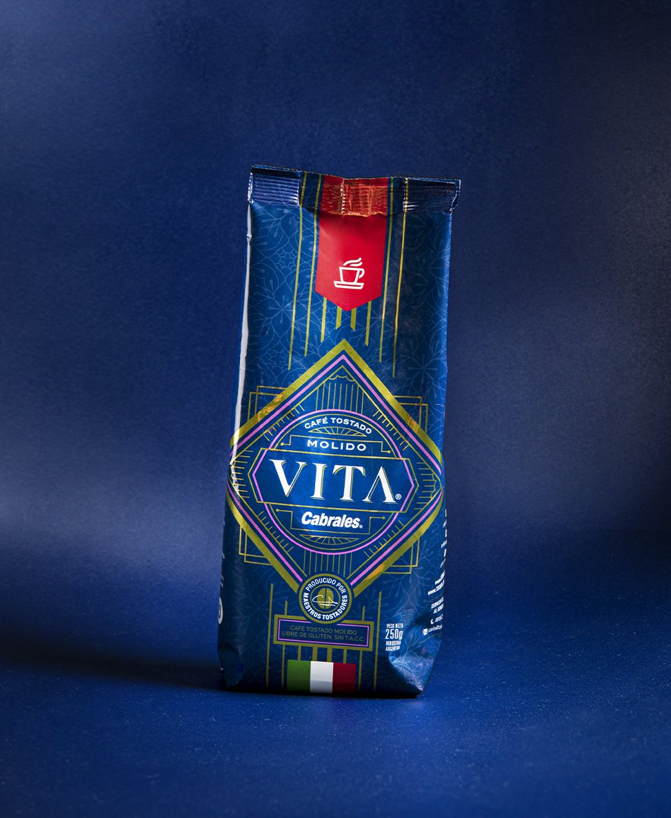 Vita es una marca que celebra la tradición, la cultura y la especialidad del café italiano. La idea nació en uno de los viajes de Germán Cabrales a Italia, con parada obligada en la estación central de Roma, donde mientras tomaba un típico ristretto, disfrutaba la elegancia y el estilo italiano tan característico. Con el aval de Cabrales, Vita es un café de calidad superior. Para el diseño nos inspiramos en las marcas tradicionales de Italia. La tipografía del logo fue dibujada en base a las primeras letras talladas en piedra de líneas puras, simples y elegantes . En el caso del packaging trabajamos el diseño con detalles y ornamentas doradas sobre un fondo azul que resulta en un estuche distinguido como el café que lleva dentro.